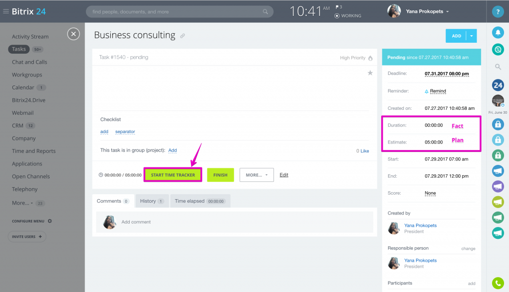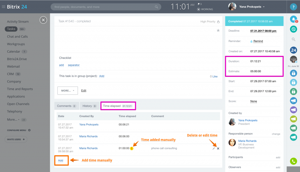 Bitrix24 中的每個任務表單中都提供了任務時間跟踪。它允許您添加每個任務所需的估計時間並自動跟踪負責用戶的實際時間。